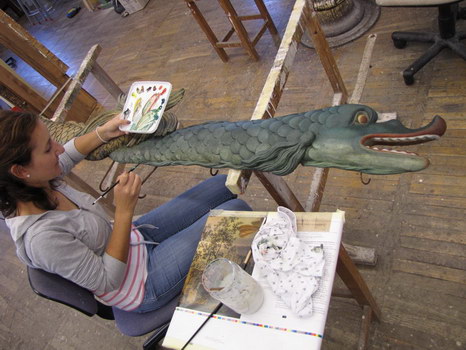 Restavriranje polihromirane ribe iz lesa in kovine.